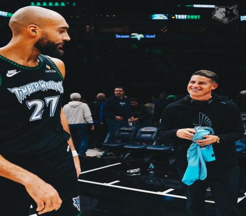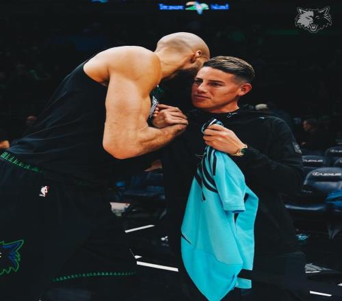 赛后,J罗与森林狼中锋戈贝尔合影留念,并送上明尼苏达联10号球衣,也获得了戈贝尔赠送的签名球衣。