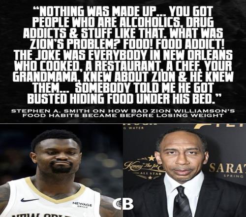 A-史密斯的原话是:“我没有编造任何东西…… 你知道有酗酒的、吸毒成瘾的那些人。那锡安的问题是什么?食物!他是食物成瘾!笑话就是,新奥尔良每个会做饭的人 —— 餐馆、厨师、你奶奶,全都认识锡安,他也认识他们……有人跟我说,他被抓到把食物藏在床底下。”